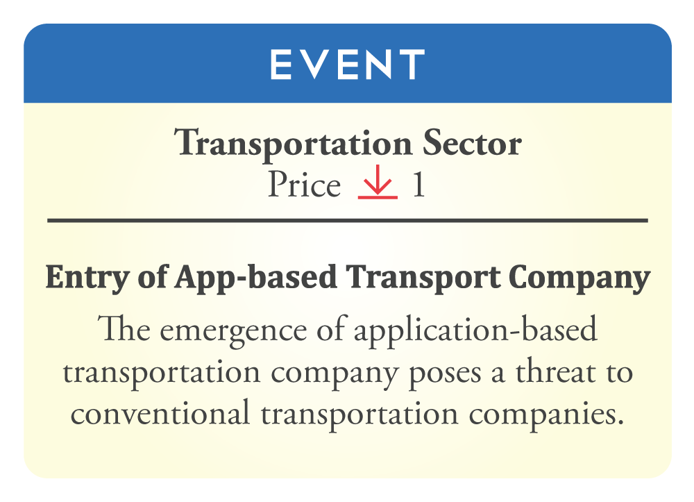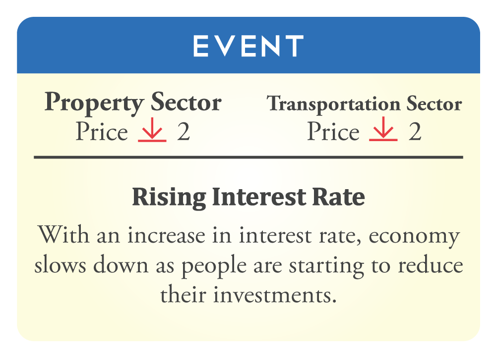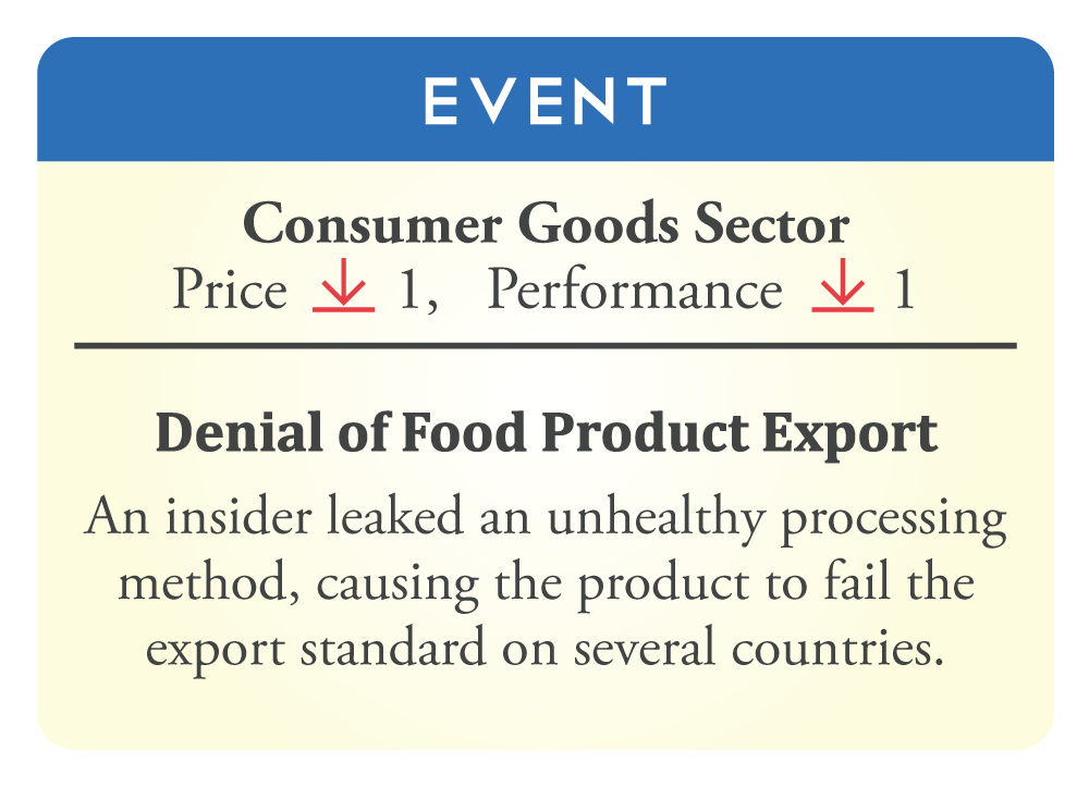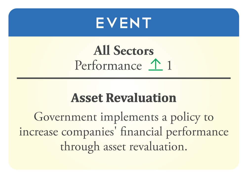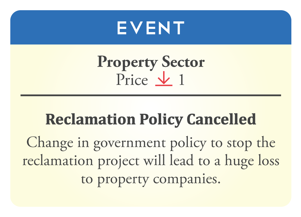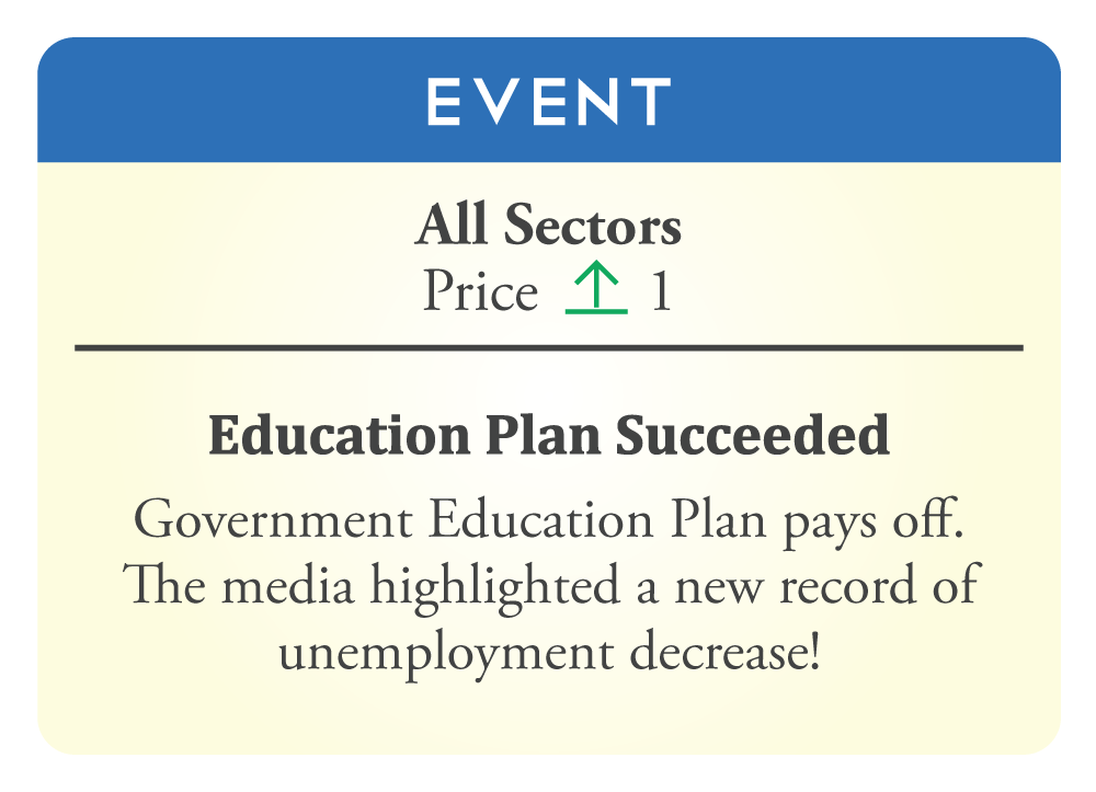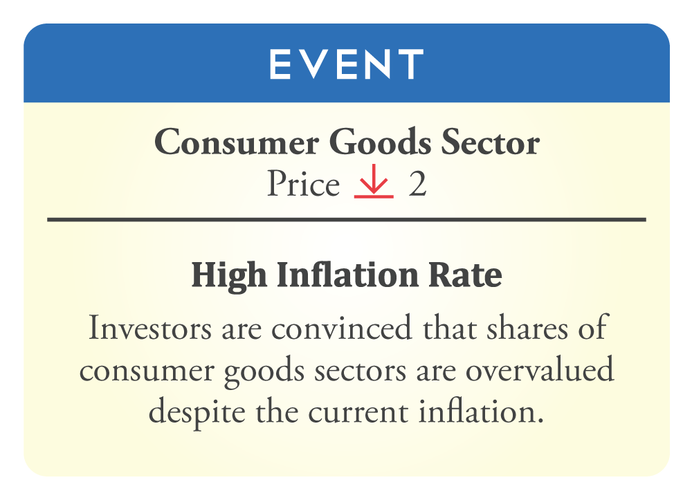 Event cards represent the events happening at the end of the semester. The card may affect either performance of a company or price of a stock, sometimes both.