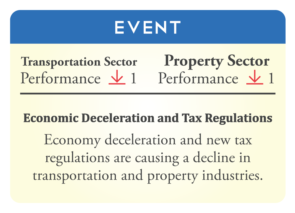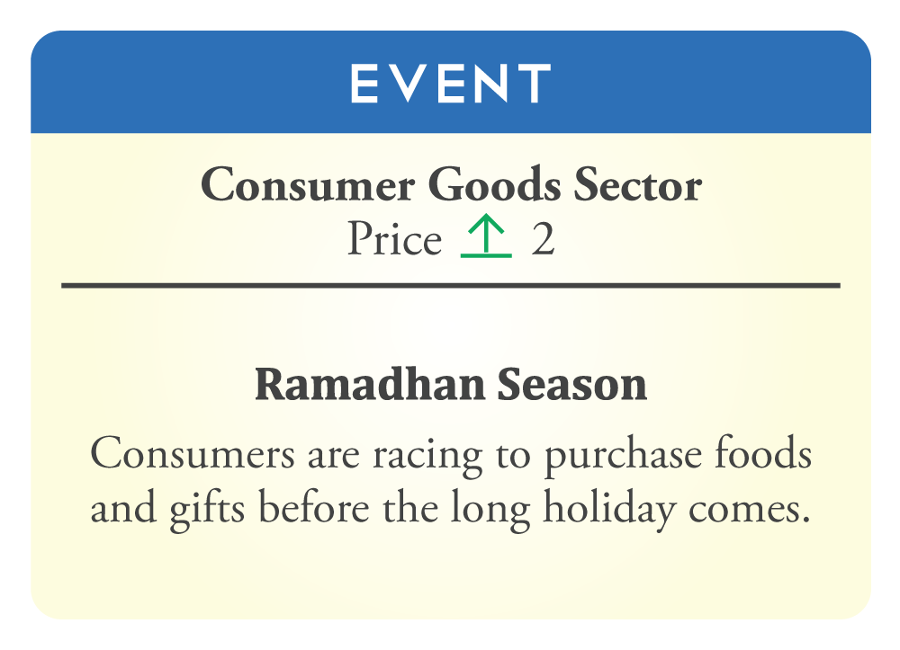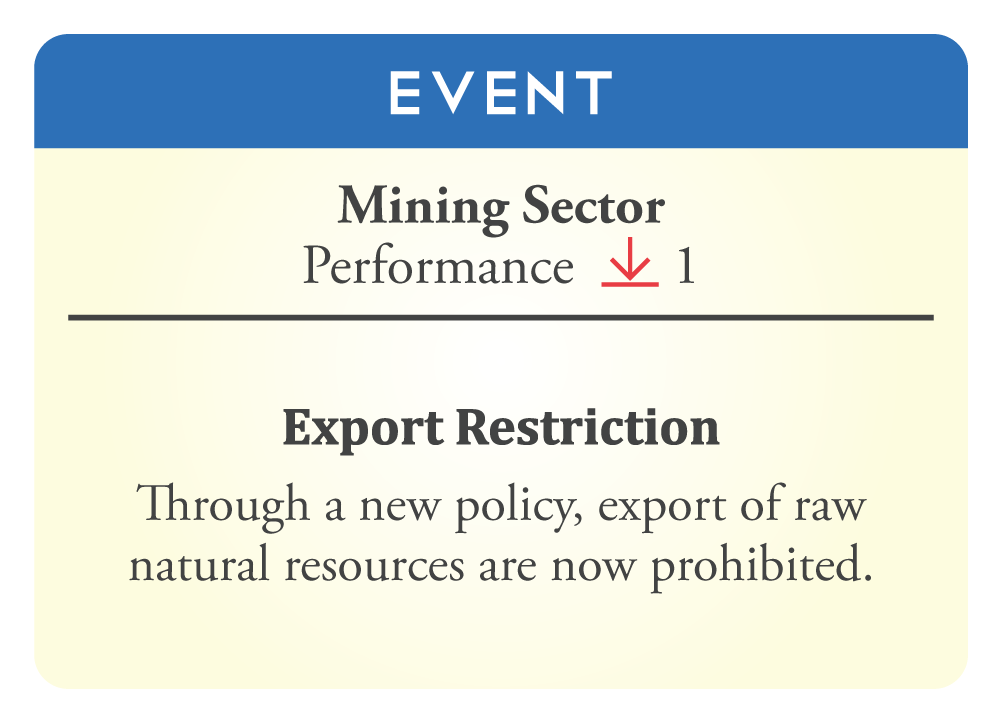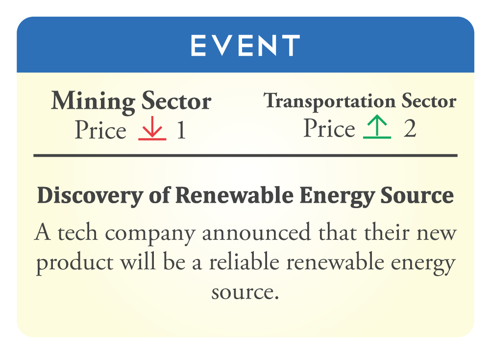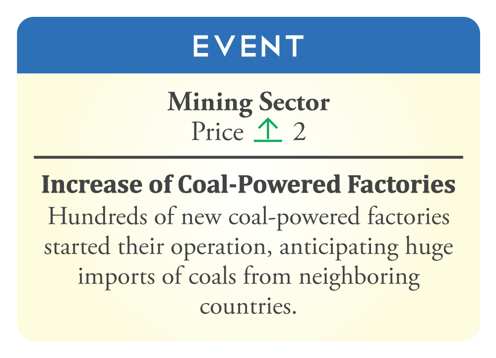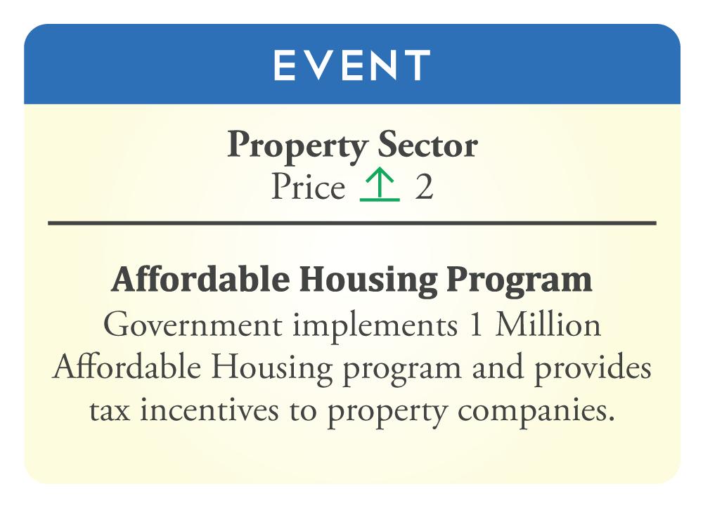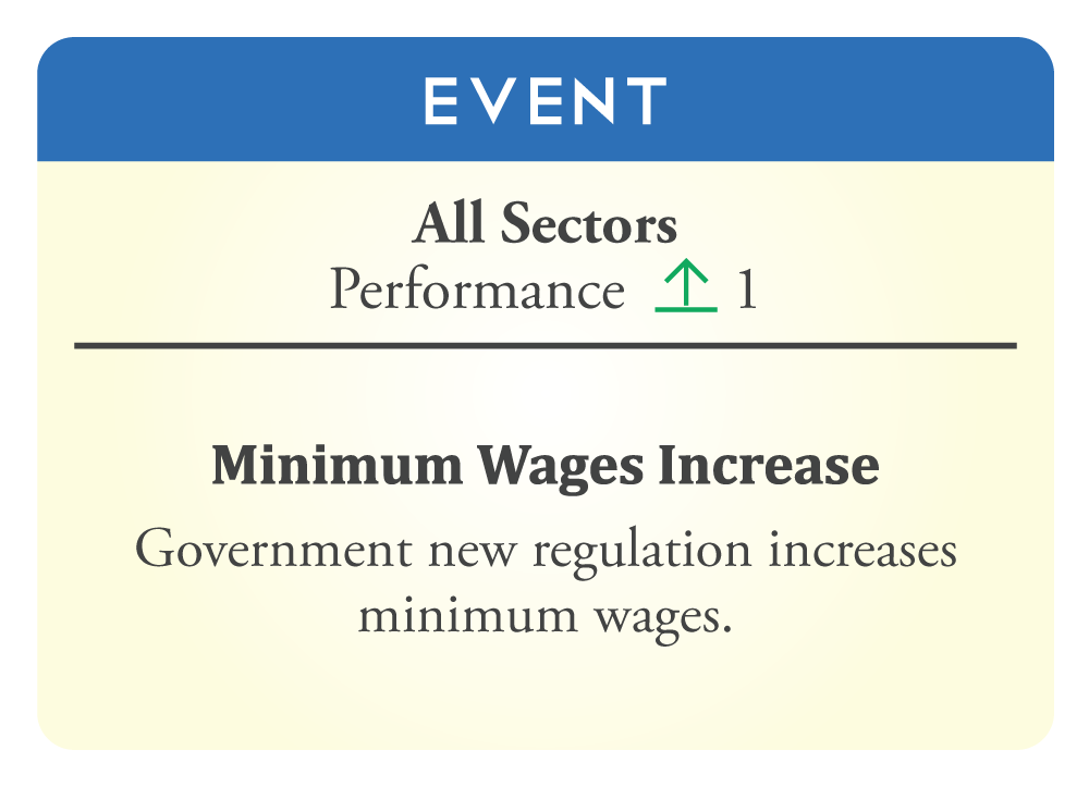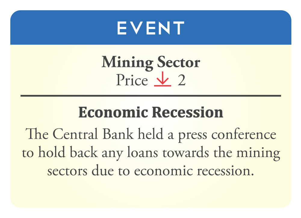 Event cards represent the events happening at the end of the semester. The card may affect either performance of a company or price of a stock, sometimes both.