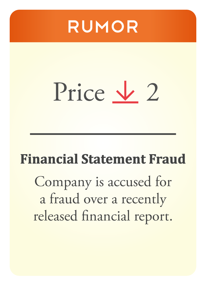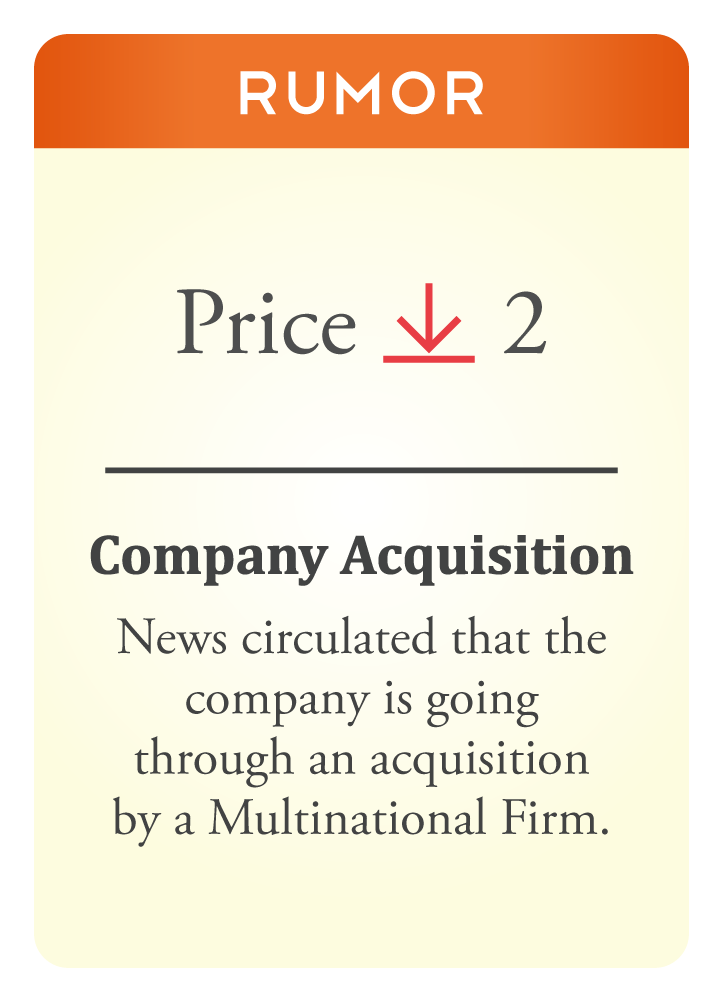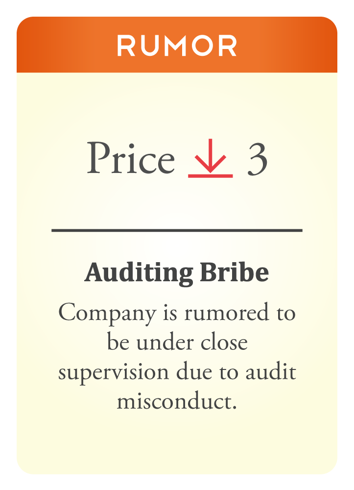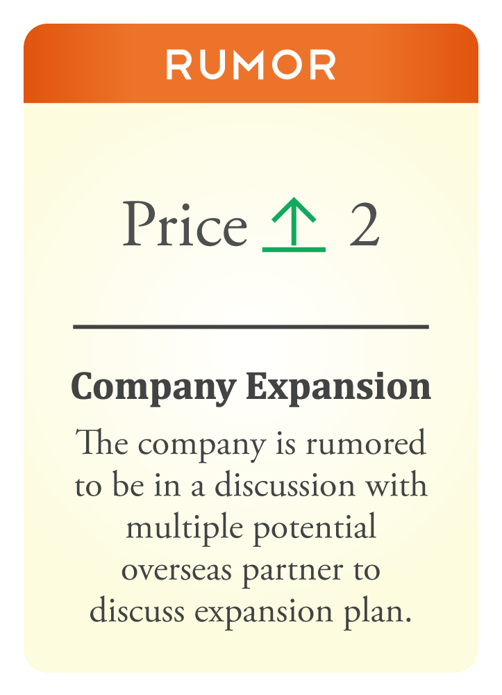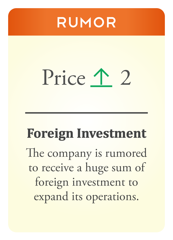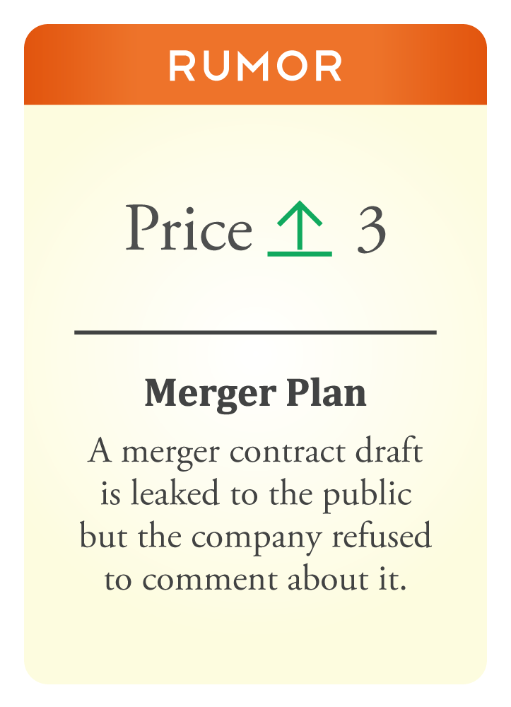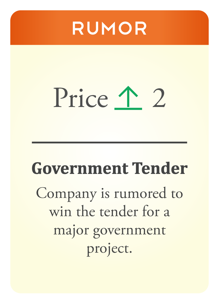Rumor cards are card that can be bought during the game and will be placed on a company board. During resolution phase, all the rumors will be revealed and could affect the price of stock.