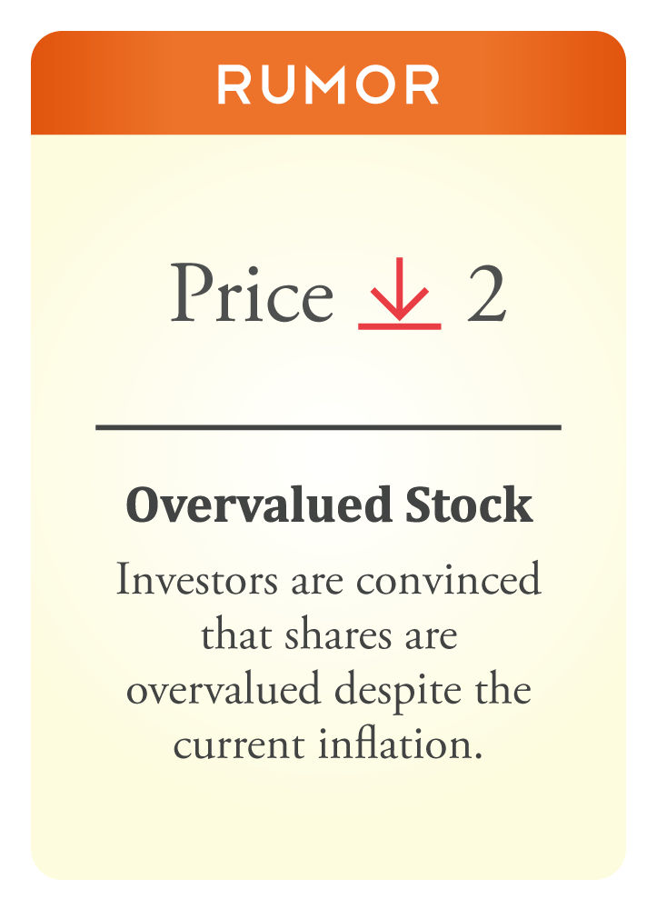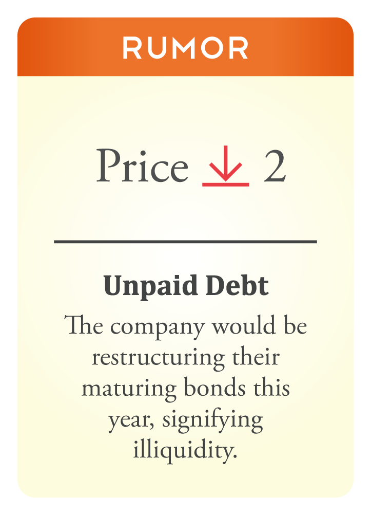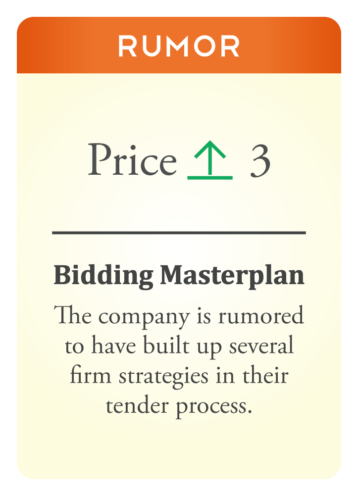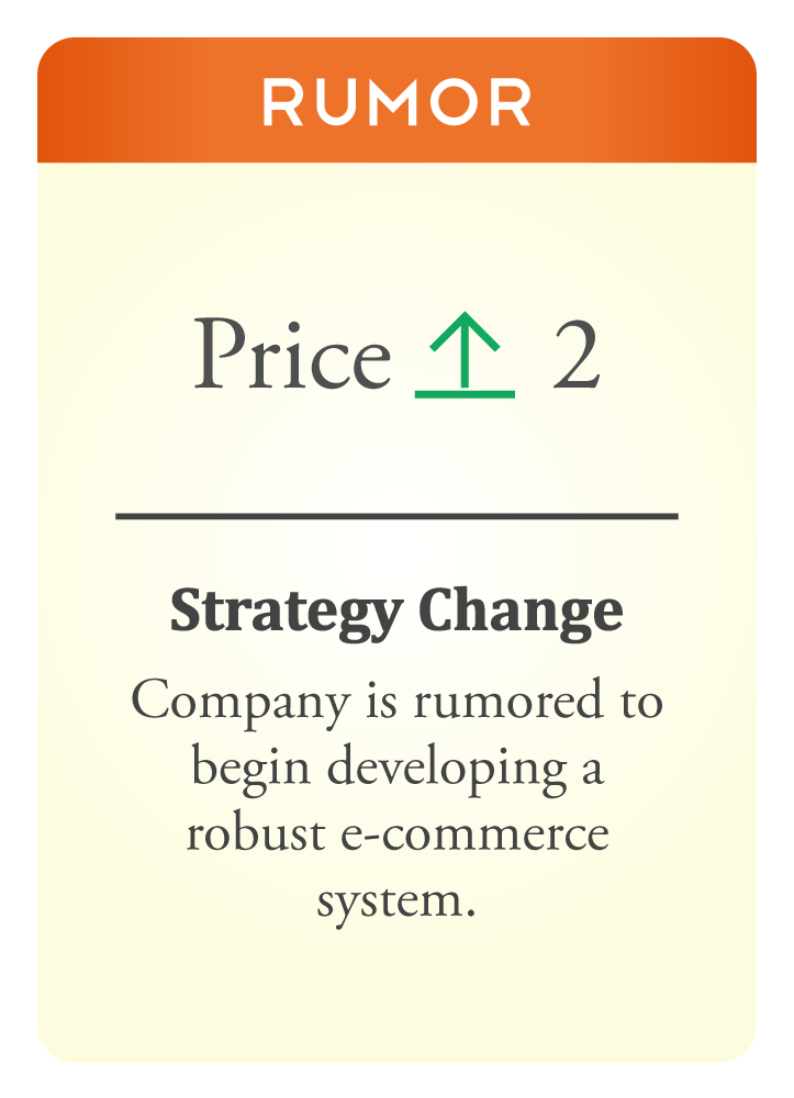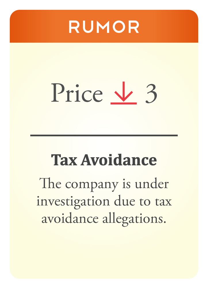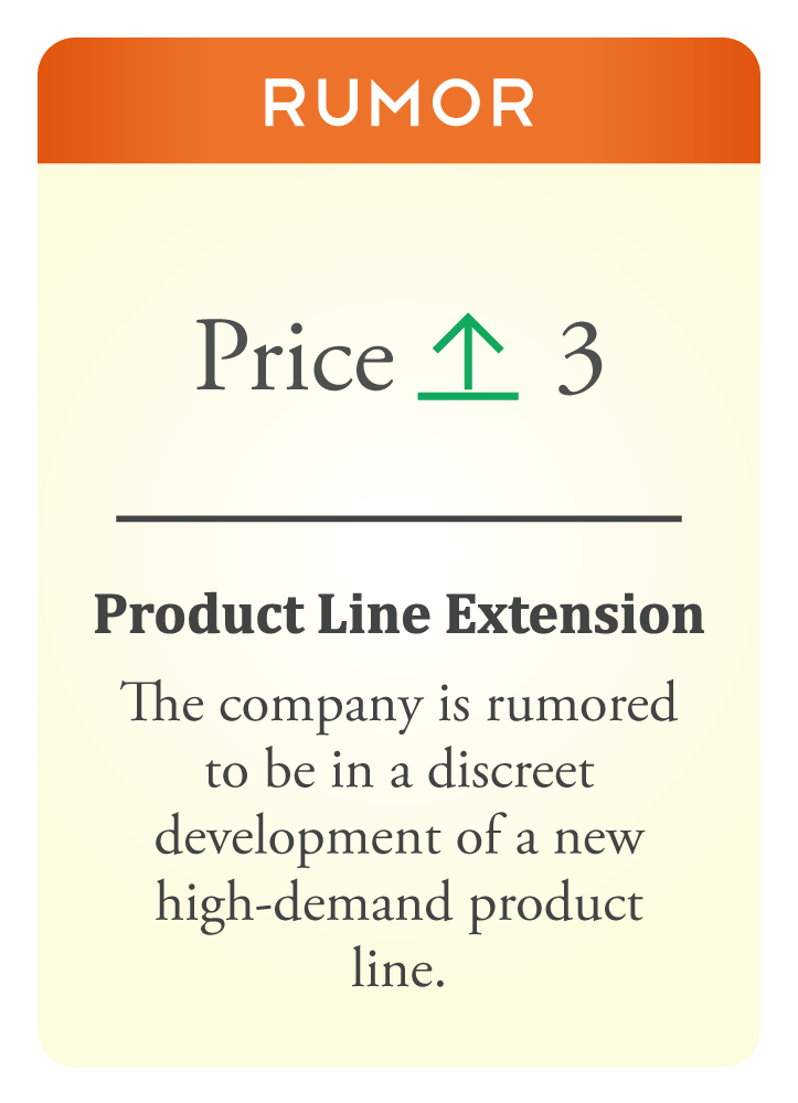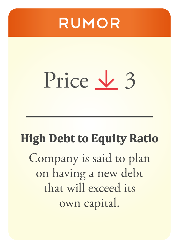 Rumor cards are card that can be bought during the game and will be placed on a company board. During resolution phase, all the rumors will be revealed and could affect the price of stock.